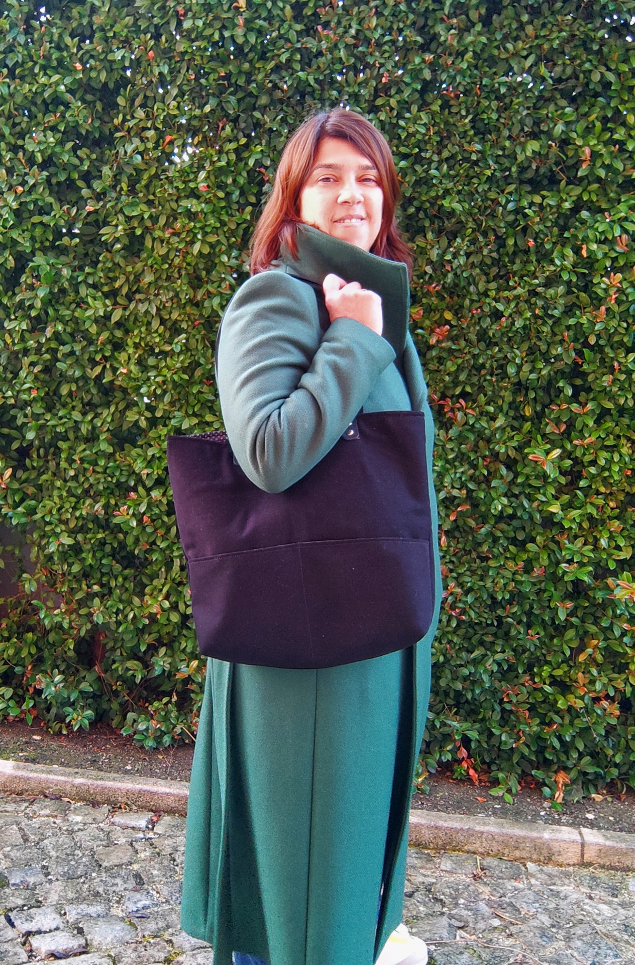 Mala estilo Tote bag, em tecido canva vermelho escuro, com dois bolsos no exterior, interior em tecido de algodão com um bolso com ziper, fecho de Íman e as alças em pele cor cascanho.
